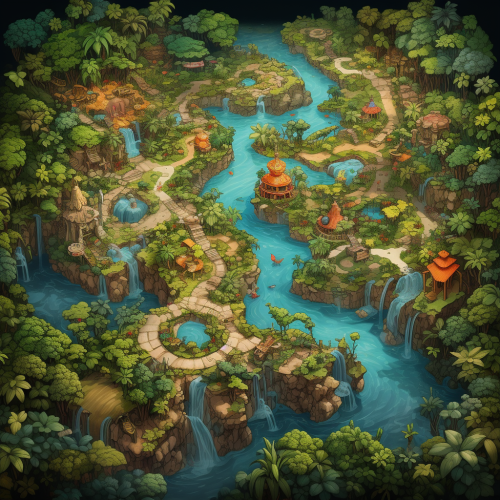 An top-down view of board game of amazon jungle world in a cartoon 2d art style. The environment is lush with winding paths leading to mayan temples, ruins, open pits and villages also a ocean coast
