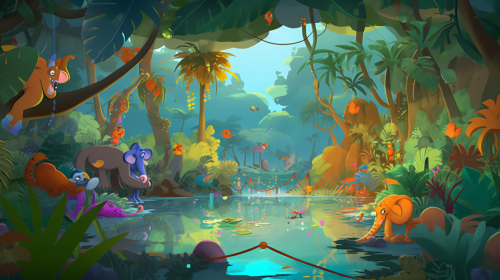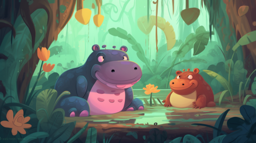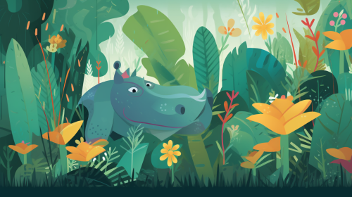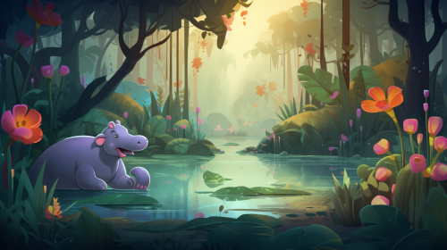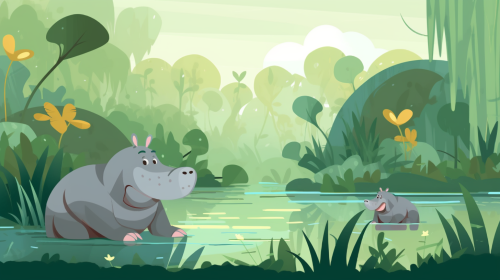 A charming children's game screen with a jungle and hippopotamus theme, featuring intuitive controls, a lovable animated hippopotamus, and interactive jungle elements, creating a visually engaging and delightful gaming experience, Illustration, vector graphics with a focus on simplicity and clarity, --ar 16:9 --v 5.0