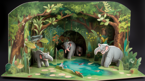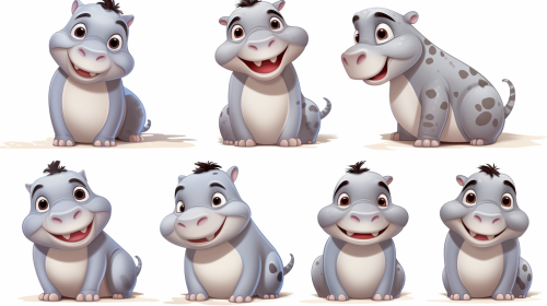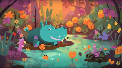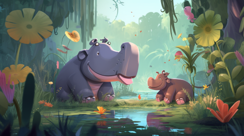 An enchanting children's game screen with a jungle theme, showcasing a lovable hippopotamus as the central character, surrounded by interactive elements, animated jungle flora, and playful background elements, creating a visually stimulating and delightful gaming environment, Artwork, vector graphics with a mix of 2D and 3D elements, --ar 16:9 --v 5.0