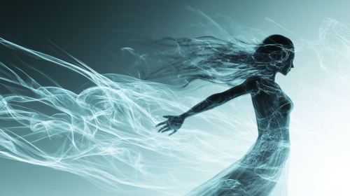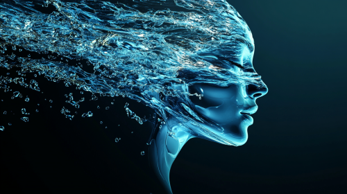 design a futuristic hightech technical image that illustrate the continuous flow of a stream of liquid that transform itself into a woman ridding it , --ar 16:9 --v 6.1