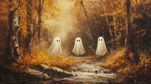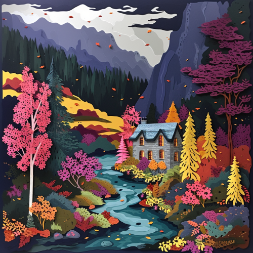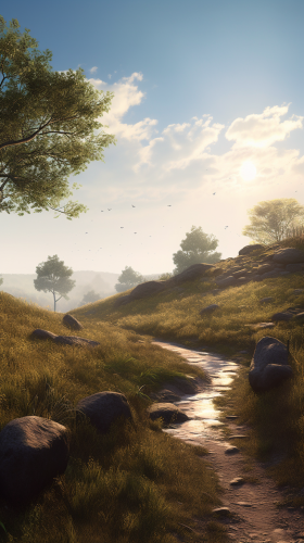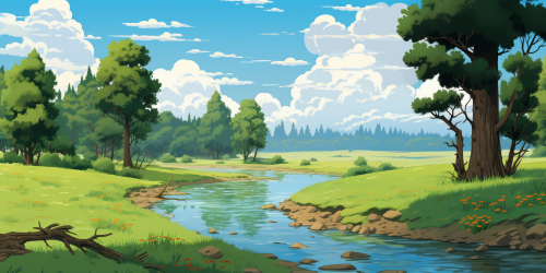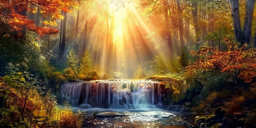 a fantasy style design depicting a nature scene during the fall time of year, autumn colors and a stream flow through an opening in the forest, there are many trees, sunlight glows through the tree tops --v 6.0 --ar 2:1