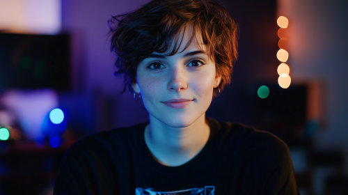 androgynous adult game streamer with short hair in their 30s, looking straight into the camera and smiling as they talk with their audience on Twitch. in a dark room with LEDs, wearing a black graphic tee shirt with long sleeves, and holding a controller in their hands. detailed Canon r5, 20mm focal length, medium shot --ar 16:9