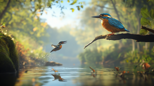 Create a photorealistic image of a kingfisher sitting on a twig above a forest stream, the bird is looking at another kingfisher who is diving into the stream below to catch a fish, suggesting movement, show blue sky as well as forest foliage, create a lot of contrast and depth in the birds colours, and varied foliage taken with a canon r5, wide angle lens, 4k --ar 16:9