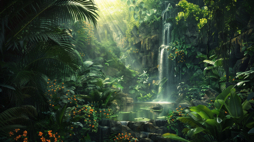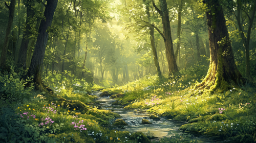 mystical forest glade, dappled sunlight filtering through dense green leaves, vibrant wildflowers dotting the forest floor, a small, clear stream bubbling through the scene, surrounded by ancient trees covered in moss, composition featuring a serene, secluded area, capturing the enchanting and inviting atmosphere of nature, in a style akin to a watercolor illustration, showcasing the beauty of the natural world. --ar 16:9