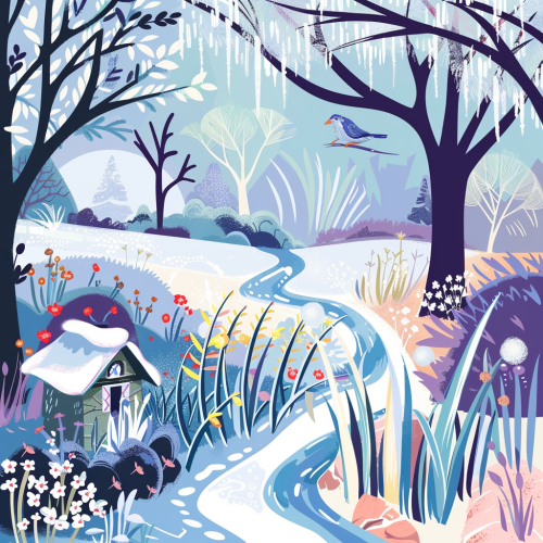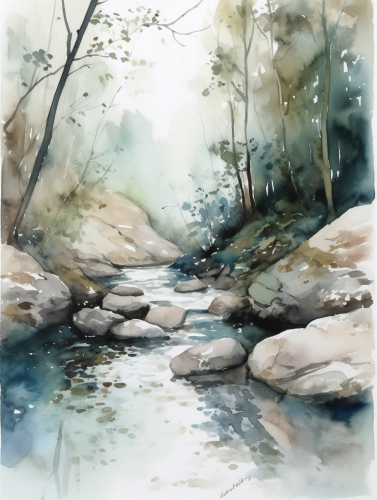 A minimalist watercolor painting, gentle stream flowing through forest with fallen leaves and stones, soft blue and green accents, peaceful atmosphere, inspired by 'Dumbrava Minunată,' airy and minimalistic details, A4 format, high-quality, 300 DPI --ar 3:4 --v 5.0