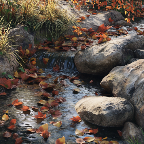 Create a realistic scene of a stream flowing between rocks, with water gently moving over the stones. The area is surrounded by fallen leaves, some of which are caught in the current, and wild grasses growing around the rocks. The atmosphere is serene, with the natural elements blending harmoniously.
