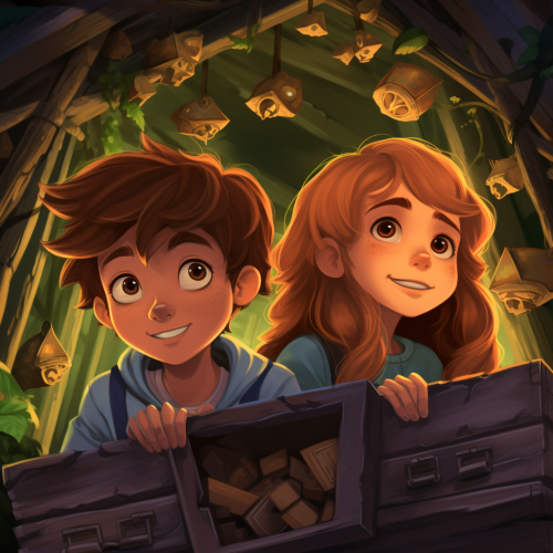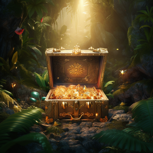 A treasure chest open with gold and gems, hidden deep in the jungle