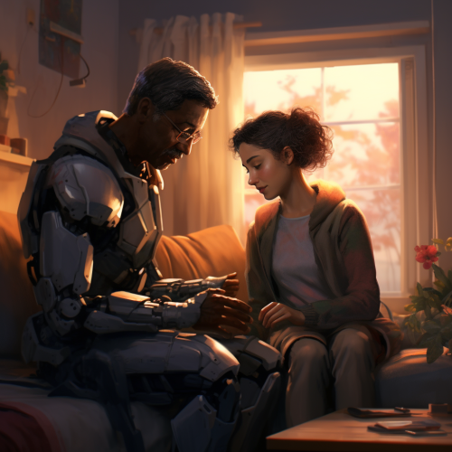 Capture the concept of AI-driven empathy through a visual narrative, depicting a heartwarming scenario where AI understands and comforts a person in need.