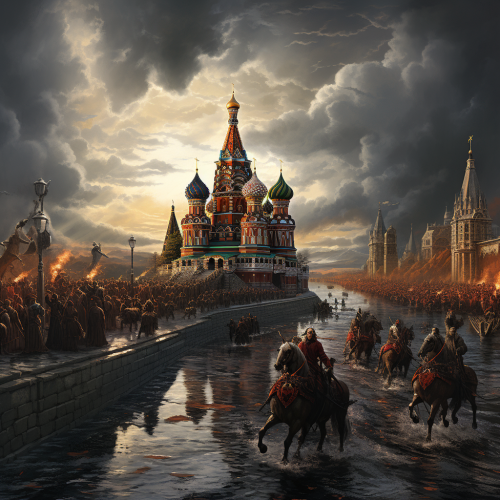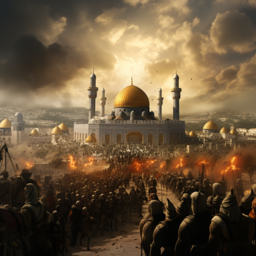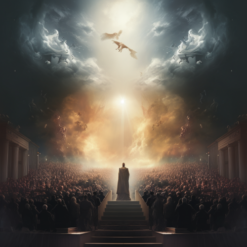 two contradictory scenes in one picture. On the left, there is a large altar surrounded by believers praying fervently (dark gloomy). On the right, there is salvation with a sky that opens and shines with divine light. - dramatic scene