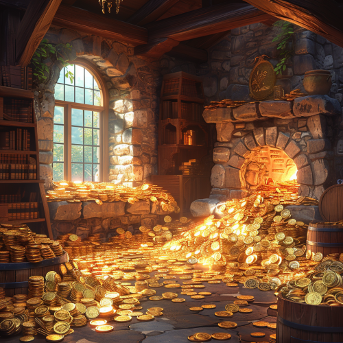 Cartoon style, room full of gold and coins, gold dungeon, gameui, fantasy style, gold dungeon --s 750 --v 6.0