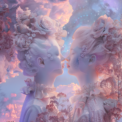 the following background for a scenario: Glam Fantasy blends with Renaissance elegance. In this visual narrative lies the concept of divine connection, two halves of the same soul that split into two bodies. The aesthetic is represented by a cosmos sky paradise, decorated with rich textures and soft colors like light pink, lavender, and powder blue, creating a dreamy atmosphere.