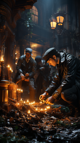 Create a visual narrative of the London police investigation, with detectives examining evidence and searching for clues. year 1888, --ar 9:16 --s 750