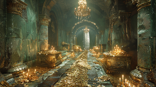a path way to the treasure chest in the treasure room filled with gold coins and jewels, in the castle with light green stone wall, The scene is softly lit, emphasizing the opulence and secrecy of the treasure hidden within --ar 16:9 --v 6.0 --s 750