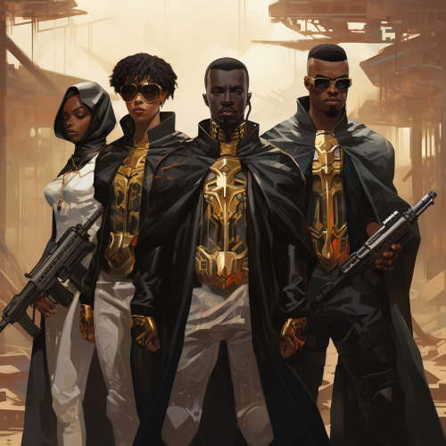 Arcane Animation Painterly art style, four sci-fi soldiers wearing white Black Panther style Nanotech suits with black cloaks, holding futuristic sci-fi energy rifles, beautiful handsome Black, Asian, African and Mexican, gold accessories