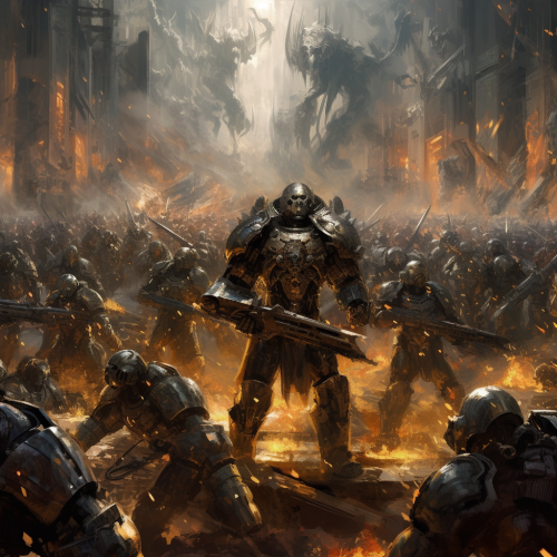 a sprawling battle scene between futuristic sci-fi Nordic berserkers/warriors and powerful legions in gray sci-fi commando army garb. there are also generals in futuristic gold armor inspired by ancient Rome. Dynamic environment. depicted as an oil painting
