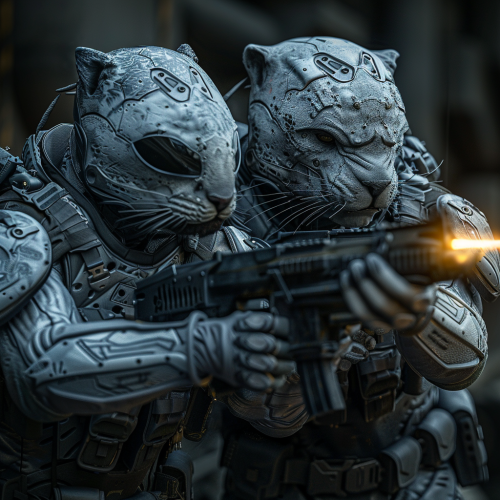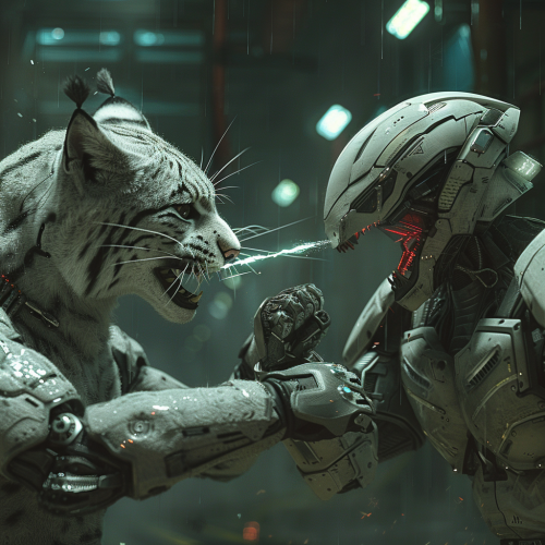 a soldier humanoid lynx and a soldier humanoid shark fight, very futuristic, photo --v 6.0 --s 250