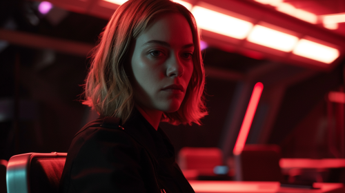 Kenzie Dalton looks intense inside sci-fi conference room, --ar 16:9 --v 6.0
