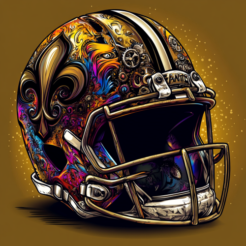 A stylized football helmet featuring intricate designs, including gears, musical instruments, and flames, centered around a prominent fleur-de-lis symbol. The background is a gradient of gold, highlighting the vibrant colors of the helmet. Below, the word SAINTS is artistically rendered with ornate lettering.