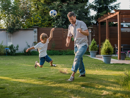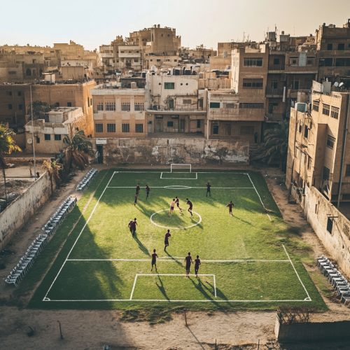 A green football field, surrounded by stadium-style chairs in a smaller, intimate setting, sits in the heart of historical Jeddah, Al-Balad. Amid the rich cultural backdrop, a group of boys energetically plays football together, their joy and camaraderie filling the air. The contrast between the modern field and the ancient surroundings creates a unique, vibrant atmosphere that bridges tradition and contemporary life