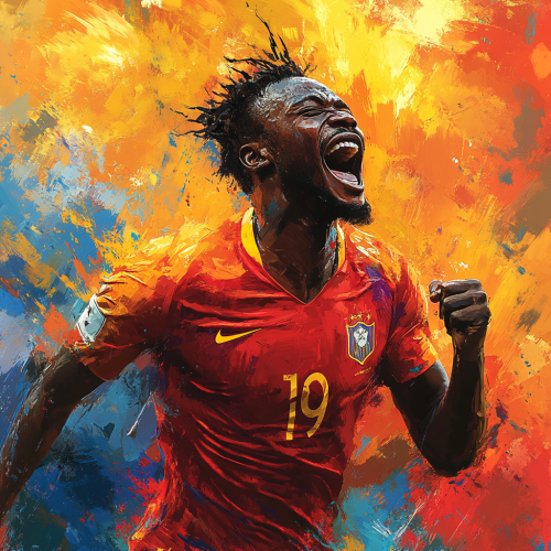 Ally Samatta in Tanzania national team jersey, expressing vibrant emotions, shouting passionately on the field, dynamic pose, colorful background, capturing the excitement of football --s 750