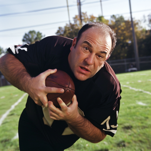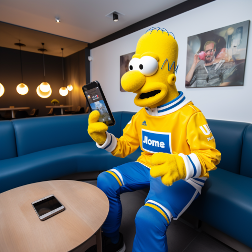 Homer, au centre du salon décoré aux couleurs de son équipe de football favorite, lève un bras triomphalement tout en tenant son smartphone de l'autre main pour publier sa première vidéo TikTok. Autour de lui, ses amis en tenues de supporters célèbrent le moment, entourés de snacks de match et de verres de bière sur une table basse, avec un match de football en arrière-plan sur le téléviseur, capturant une atmosphère festive et unie par la passion du football.