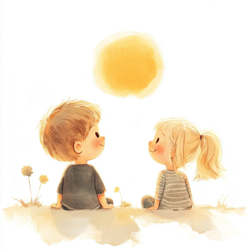 joyful little boy 2 years with brwon hair and blond girl with 4 years, seeing the sunset, in the style of minimalistic drawings, white background, ultrafine detail, creative commons attribution, mori kei, painted illustrations, serene faces,