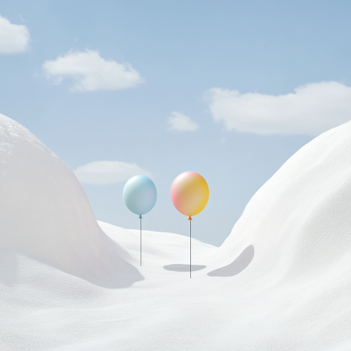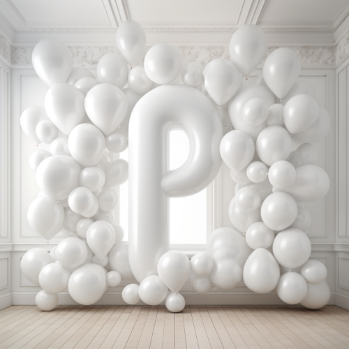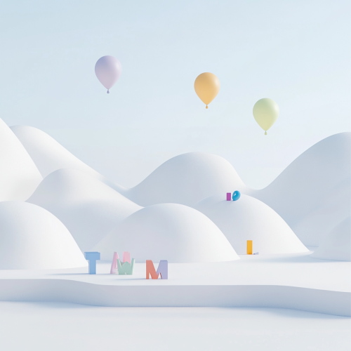 A serene, white landscape designed for English language education. The scene features three or four vibrant balloons shaped like English alphabet letters placed at the edges of the image. The clean, crisp ground and the bright colors of the balloons create a harmonious balance between simplicity and creativity, making the setting feel educational, fun, and inspiring.