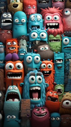 colorful collage with different funny crazy, angry people who are commenting bad things with little fingers and big eyes on square fields, fields overlap, interactions between square, different sizes square, for kids --ar 9:16 --s 250 --v 5.2