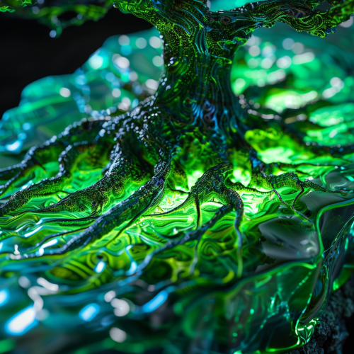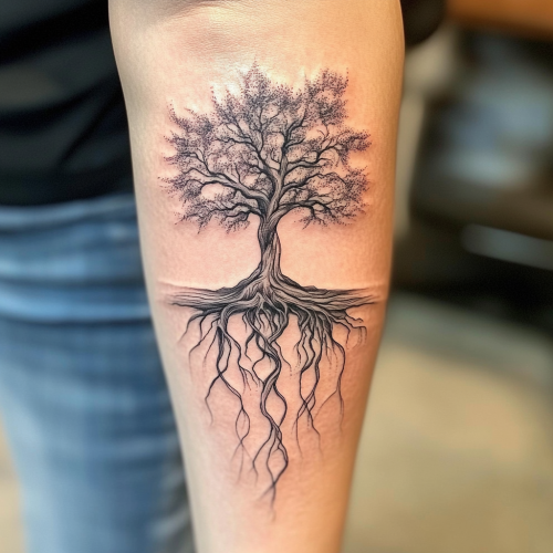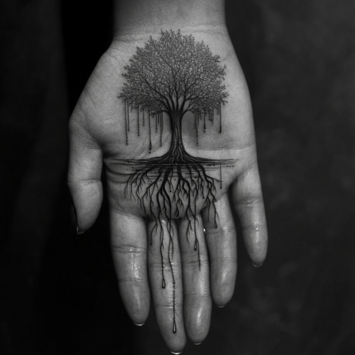 a fine line abstract tattoo of a healthy tree growing by still water and its roots extending deep. The tree is centered in the palm of a hand and the roots are handing off the side of the hand. Water is dripping between the fingers of the hand.