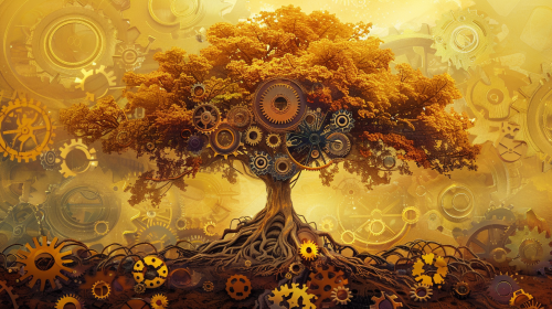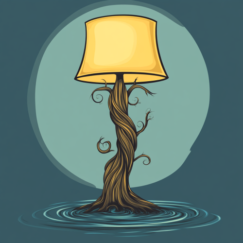 color vector logo, a lamp created with a tree with roots as a pedestal that enters the lampshade, an ecru lampshade, a column of water that starts from the bottom and rolls upwards in a spiral around the trunk up to the lampshade , lampshade on. only 4 colors total without gradients, simple