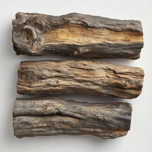 On a white background, three thick tree roots are stacked horizontally, overlapping each other. The surface is rough and textured, with a brown color. --s 50