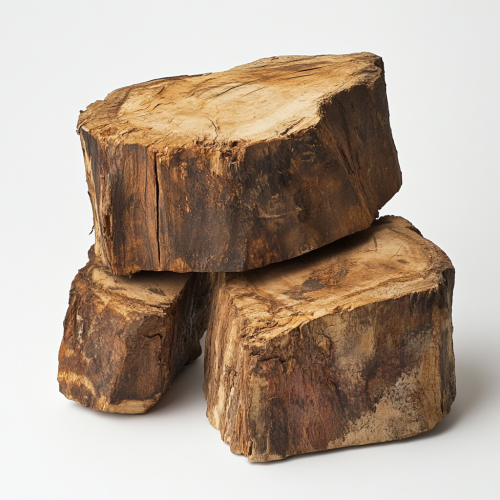 On a white background, three thick tree roots are stacked horizontally, overlapping each other. The surface is rough and textured, with a brown color. --s 250