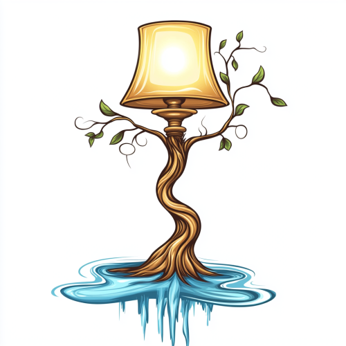 color vector logo, a lamp created with a tree with roots as a pedestal that enters the lampshade, a lampshade in ecru. a column of water starts from the bottom and rolls upwards in a spiral up to the lampshade. the lampshade turned on. only 4 colors total without gradients, simple