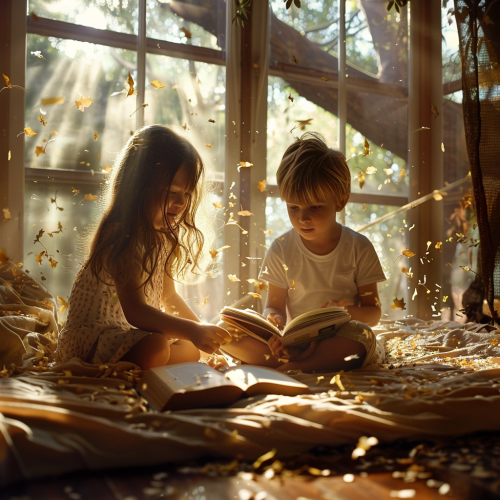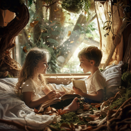 a hyper realistic and high-definition photo of happy, curious, and courageous 7-year-old girl and boy playing and reading in their bedroom. The bedroom is open to the Australian native bush, gum tree roots and moss spill into the room. Glowing leaves fall above the children and the golden pillars of sunlight. The suspended dust blooms and glows in the golden light. Evoke a sense of adventure in a world of limitless magic.