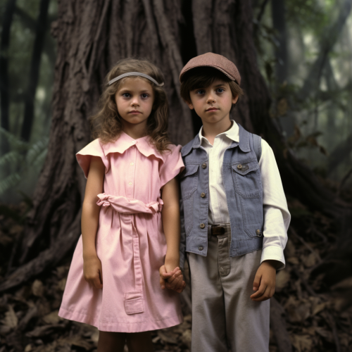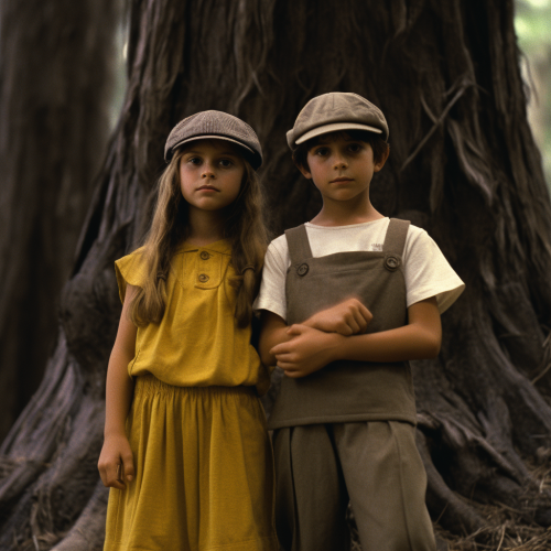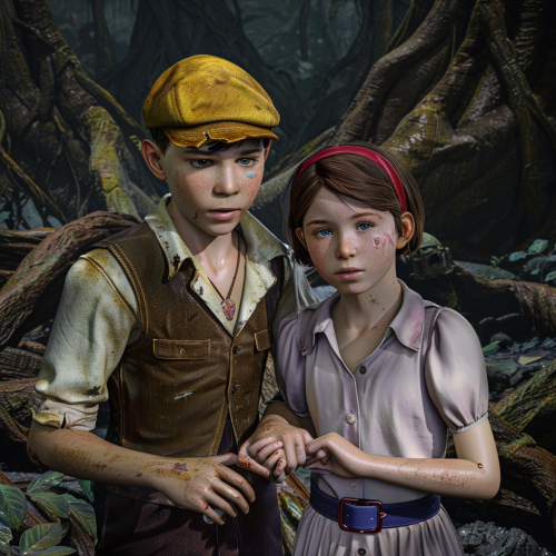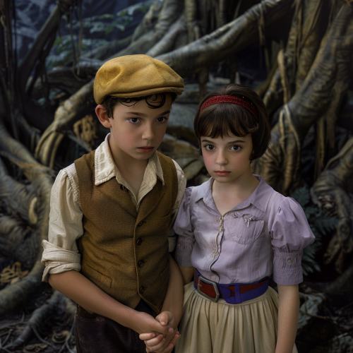 Create a realistic live-action photograph of a young boy and girl standing together in a forest with dark, twisted roots in the background. The boy is wearing a light brown cap, white shirt, and a brown vest. He has short hair and is holding the girl’s hand tightly. The girl is wearing a pink dress with a belt, and she has a red headband in her hair. Both characters have serious expressions and are looking slightly to the side. Their poses are tense, and they have some dirt marks on their clothes and faces, indicating they have been through a rough situation. The boy is on the left, and the girl is on the right, matching the original animated scene exactly. --v 5.1