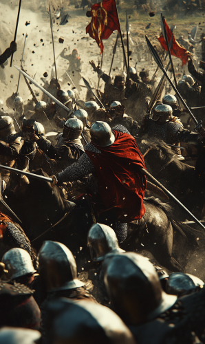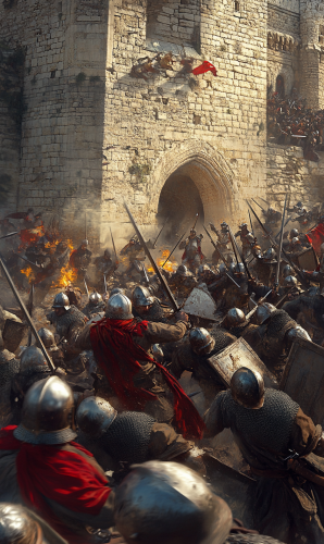 a photorealistic image of the battle at jerusalem; we're right in the middle of it with Godfrey of Bouillon at the centre of the chaos of knights and medieval moslim warriors fighting --ar 3:5