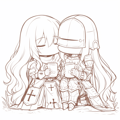 outline The Knights Templar are waifus, two best friend waifu knights, black ink on white paper, no color, full body, Chibi anime Catholic, --style raw --s 750 --niji 6