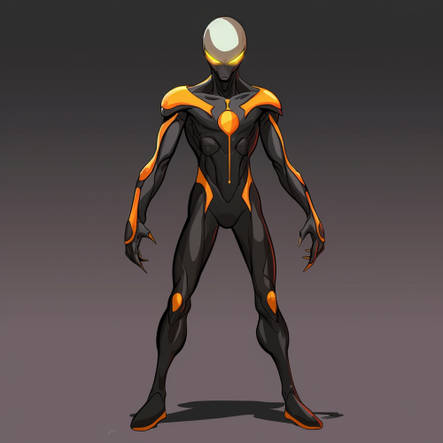 Alien, black body, orange eyes, strong fighting power, Frieza, elemental, humanoid character design, standing pose, side pose, Studio Ghibli style, comic book drawing style --v 5.2 --no BackGround --style raw