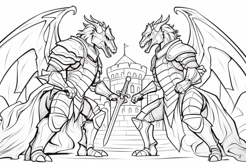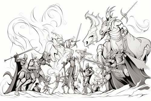 a battle scene of knights fighting a group of fantasy creatures. simple coloring page for kids, line art style with thick black bold lines and white background --ar 3:2