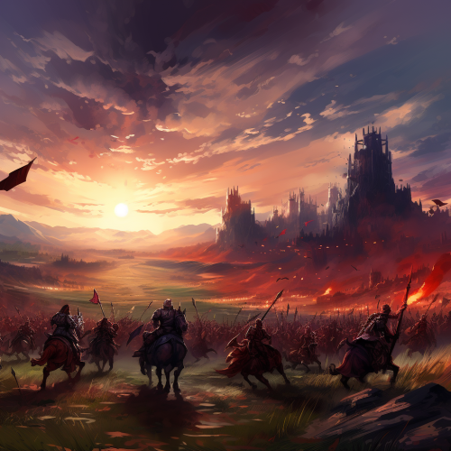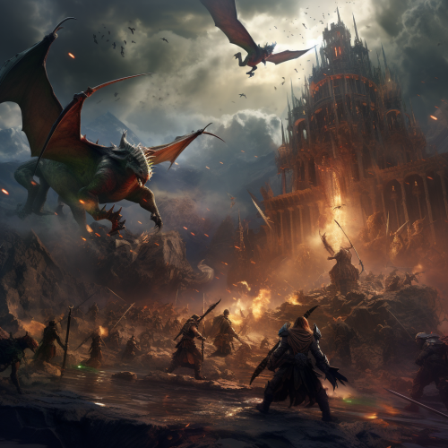 epic fantasy scene with knights fighting orcs, elvin archers shooting at dragons