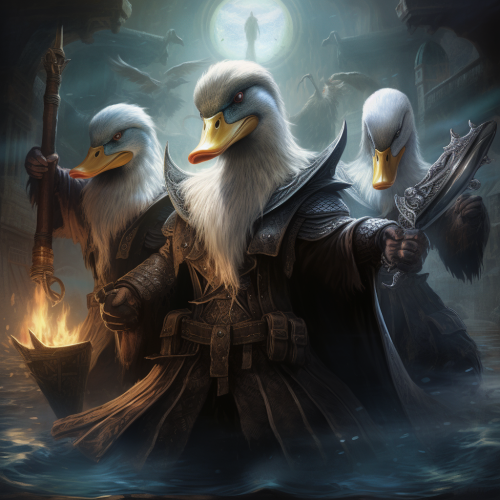 duck knights fighting against an evil goose wizard, dark 80s fantasy movie