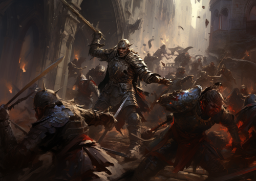 dynamic fantasy medieval fighting scene of holy knights clashing with undead warriors, epic battle, highly detailed, in the style of greg rutkowski, --ar 7:5