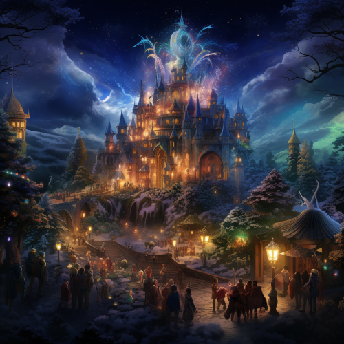A magical, fantasy world with mythical creatures, wizards, and fairies celebrating the New Year in an enchanted forest or a majestic castle.
