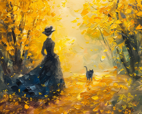 acrylic painting of a lady in dress with a cat walking in a beautiful secret autumn forest , falling yellow leaves, soft pastel colours, impressionistic by Monet, –style raw --ar 5:4 --v 6.0
