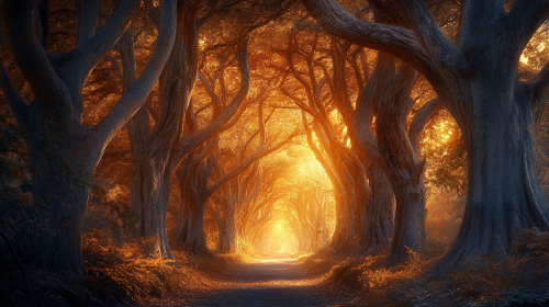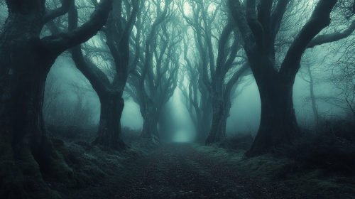 beautiful ethereal image of a cathedral of trees, towering tree cathedral, atmospheric, hauntingly beautiful image, mysterious, sombre and misty forest --ar 16:9