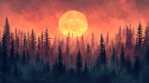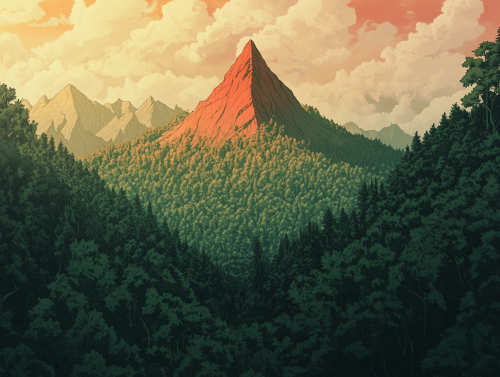 A tiny mountain peak in a vast temperate forest. The trees are massive, old, thick, green, and the forest is seemingly impenetrable, with no clearings, and many different kinds of trees reaching to the horizon. The forest has a mystical energy about it. A tiny mountain appears in the center. The mountain is colored red by a setting sun, as are the clouds. Fantasy RPG setting, wide angle, detailed, dramatic atmosphere. --ar 4:3 --v 6.1
