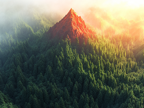 A tiny lonely mountain peak in a vast temperate forest. The trees are massive, old, thick, green, and the forest is seemingly impenetrable, with no clearings, and many different kinds of trees reaching to the horizon. The forest has a mystical energy about it. A tiny mountain appears in the center. The mountain is colored red by a setting sun, as are the clouds. Fantasy RPG setting, wide angle, detailed. Wild nature, dramatic atmosphere. --ar 4:3 --v 6.1