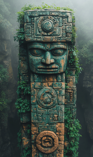 Capture a majestic totem sculpture amidst a dense forest, using Pantone 343 C (forest green) for the foliage and Pantone 18-1438 TPX (terra cotta) for the sculpture's texture, evoking a sense of ancient artistry. --ar 3:5 --v 6.1 --s 750