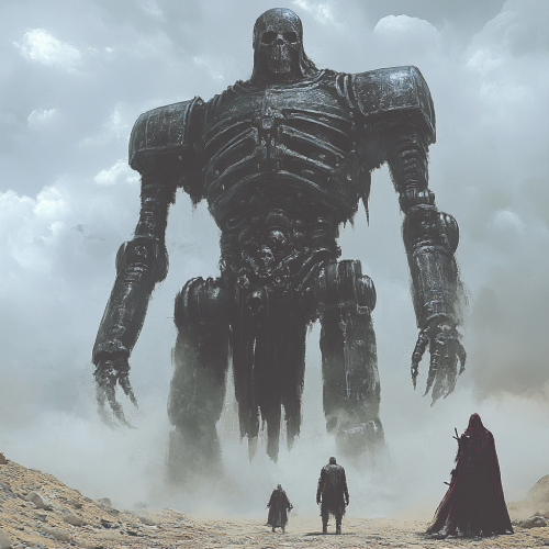 a large Machine, three times larger than a man, looms over the weary travelers. It's looks like a huge undead black Skelton wearing armor like a evil Knight Templar.