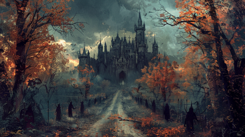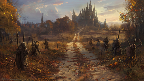 Orc prisoners impaled on each side of a dirt road leading to a castle in the distance, Autumn, Haunting, eerie, Fantasy art, Ravenloft Art, Magic the gathering art style, Dungeons and Dragons art style, color::3 --aspect 16:9 --version 6.0